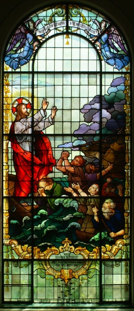 The most important message of the window, as of the Gospel account, is that Jesus truly is the Son of God. Throughout his teaching Jesus proclaims to be God’s own Son sent to reveal the Father’s will. But words are not enough to convince the people of Israel; they require “mighty works and wonders and signs”. And what better way is there for Jesus to prove his point than to control the heavens and sea made by the Father in the first days of creation? Designing this image, the artist might have drawn upon the medieval pictorial tradition for God creating the world found at the start of Bibles. In a series of images depicting the first days, God, shown as the Son, brings forth by means of a simple hand gesture the various elements and creatures of the earth, which in turn appear in the sphere he holds in his other hand. The window of Jesus calming the seas does more than visualize a past event; it invites us today to turn to the Lord, especially in times of trouble. The image reminds us through mere paint and glass of the awesome power of God, as it warns us of the limited nature of humankind. Moreover, implied in the juxtaposition of believing and unbelieving apostles is the question, “Which part of the boat do you inhabit?” |