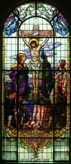 Prominently featured in the center of the window Jesus hangs dead upon the cross. His closed eyes, pale flesh and the surrounding dark clouds signify his passing. Matthew, Mark and Luke tell how darkness came over the entire earth from the sixth to the ninth hour, the moment when Christ died. To Jesus’ right is St. John, the beloved disciple, who remained with him to the end and for this reason always figures in crucifixion scenes. The artist has depicted John lovingly gazing upon his teacher and friend and praying to him with outstretched hands. On Jesus’ left is a woman draped in an American flag who can only be Lady Liberty. She replaces the Virgin Mary who traditionally stands opposite John at the foot of the cross. Perhaps to disassociate her from Mary, the artist has placed her on Jesus’ left, as Mary traditionally stands on his right. In the foreground, below the cross, an American sailor and soldier kneel. The latter, known as a doughboy, holds low to the ground an American flag that unfurls on the steps leading to the cross, an act which suggests that God is greater than country.