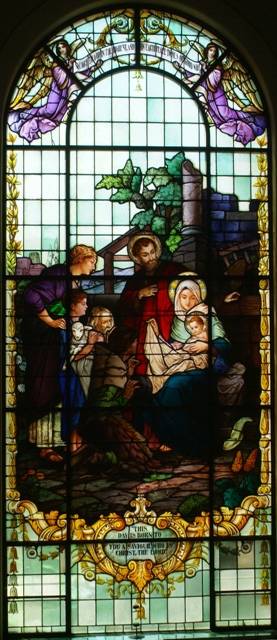 The Gospel of Luke tells us the most about how Mary and her husband Joseph traveled to Bethlehem to be enrolled in the census. When they arrived in Bethlehem there was “no room at the in.” and the only place for shelter was a stable. Mary gave birth and the only place to lay her son was a manger—an animal’s feeding bowl! Meanwhile, an angel of the Lord appeared to shepherds guarding flocks in a nearby field and proclaimed to them the quotes accompanying the image. At the top of the window the angel says, “Glory to God in the highest; and peace to men of good will.” (Luke 2: 14) At the bottom he continues, “For this day is born to us a savior who is Christ the Lord.” (Luke 1: 11) Hearing these extraordinary words, the shepherds go in haste to Bethlehem, where they find the couple with their infant son in humble surroundings.