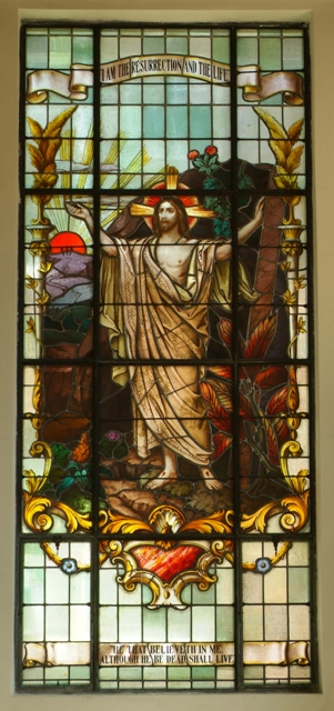 The lack of textual description for the resurrection has generated a wide range of visual responses to it. The artist responsible for the window at St. John’s created a unique depiction. In the center of the window the risen Lord stands in front of the tomb, represented here as a rocky outcrop surrounded by foliage. With his right hand he pushes back the stone slab that sealed the tomb, while with his left he reaches upward, a motion paralleling his own resurrection. Generally, artists do not portray Christ opening the tomb, but rather depict him victoriously rising from it or boldly standing in front of it. In his resurrected—divine—state Christ is not limited by time and space and thus need not open any door. Perhaps the artist portrays Jesus pushing the stone back to signify his power as God the Son—an allusion to pushing open the gates of heaven or back the gate of death? If this is the case, then his upturned hand in the window might express his thanks to the Father for answering his prayer. The quotes in the window pertain to Jesus’ resurrection: “I am the resurrection and the life” (John 11: 25) and “He that believeth in me although he be dead, shall live.” (John 11: 25-26)  He says these words upon raising Lazarus from the dead. Jesus’ presence in front of the tomb’s entrance prevents us from seeing inside it and thus we must imagine the rock-hewn tomb where they laid his wounded body and shroud left behind. Or perhaps the artists has depicted Jesus pushing back the door to reassure us that he will push back the stone of our tombs.