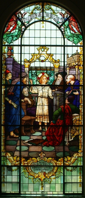 The window at St. John’s exhibits a youthful Jesus, barefoot and dressed in a simple white robe, standing in the temple precinct among a group of teachers. As he speaks he raises one hand, the traditional sign of oration. Perhaps he poses a question or answers one, as mentioned in the banderole above, “They found him in the temple sitting in the midst of the doctors, hearing them and asking them questions.” (Luke 2: 46) Around him, six men dressed in traditional Jewish garb sit and listen attentively. Two lean forward to hear him better. To Jesus’ left, a man in blue points to the book held in his hand, while at the same time he looks directly at Jesus. His actions suggest that he compares the boy’s teaching with that of his source. Across from him, another man, also in blue, grasps a scroll. Mostly assuredly the texts these men hold are of sacred scripture. The men’s faces are void of expression. However the quote below provides their thoughts, “An all that heard him were astonished at his wisdom and his answers.” (Luke 2: 47) A partially unrolled scroll and closed book rest on the stone floor before Jesus.
